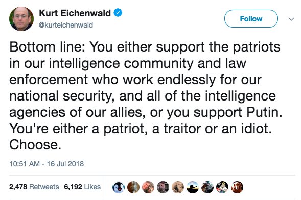 “Bottom line: You either support the patriots in our intelligence community and law enforcement who work endlessly for our national security, and all of the intelligence agencies of our allies, or you support Putin. You’re either a patriot, a traitor or an idiot. Choose”